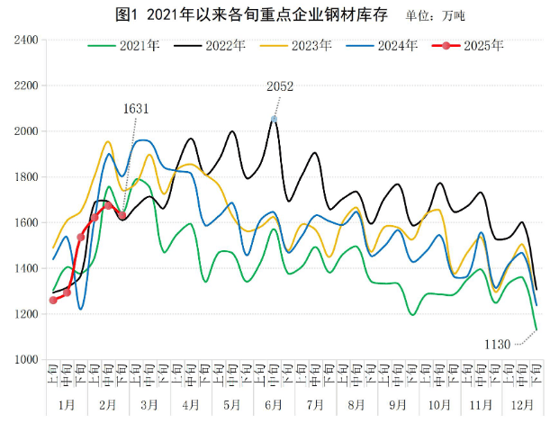 2025年2月下旬,重點(diǎn)統(tǒng)計(jì)鋼鐵企業(yè)(以下簡(jiǎn)稱“重點(diǎn)企業(yè)”)鋼材庫(kù)存量1631萬(wàn)噸,環(huán)比上一旬減少42萬(wàn)噸,下降2.5%;比年初增加394萬(wàn)噸,增長(zhǎng)31.9%;比上月同旬增加96萬(wàn)噸,增長(zhǎng)6.3%;比去年同旬減少171萬(wàn)噸,下降9.5%,比前年同旬減少111萬(wàn)噸,下降6.4%(見(jiàn)圖1)。